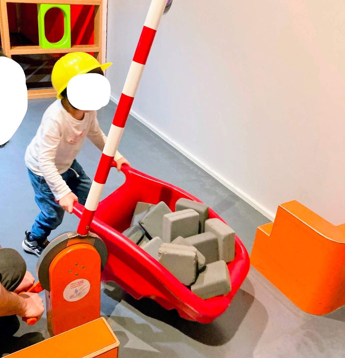 ヘルメットを借りて、工事現場のお仕事を再現するようなブースがあります。